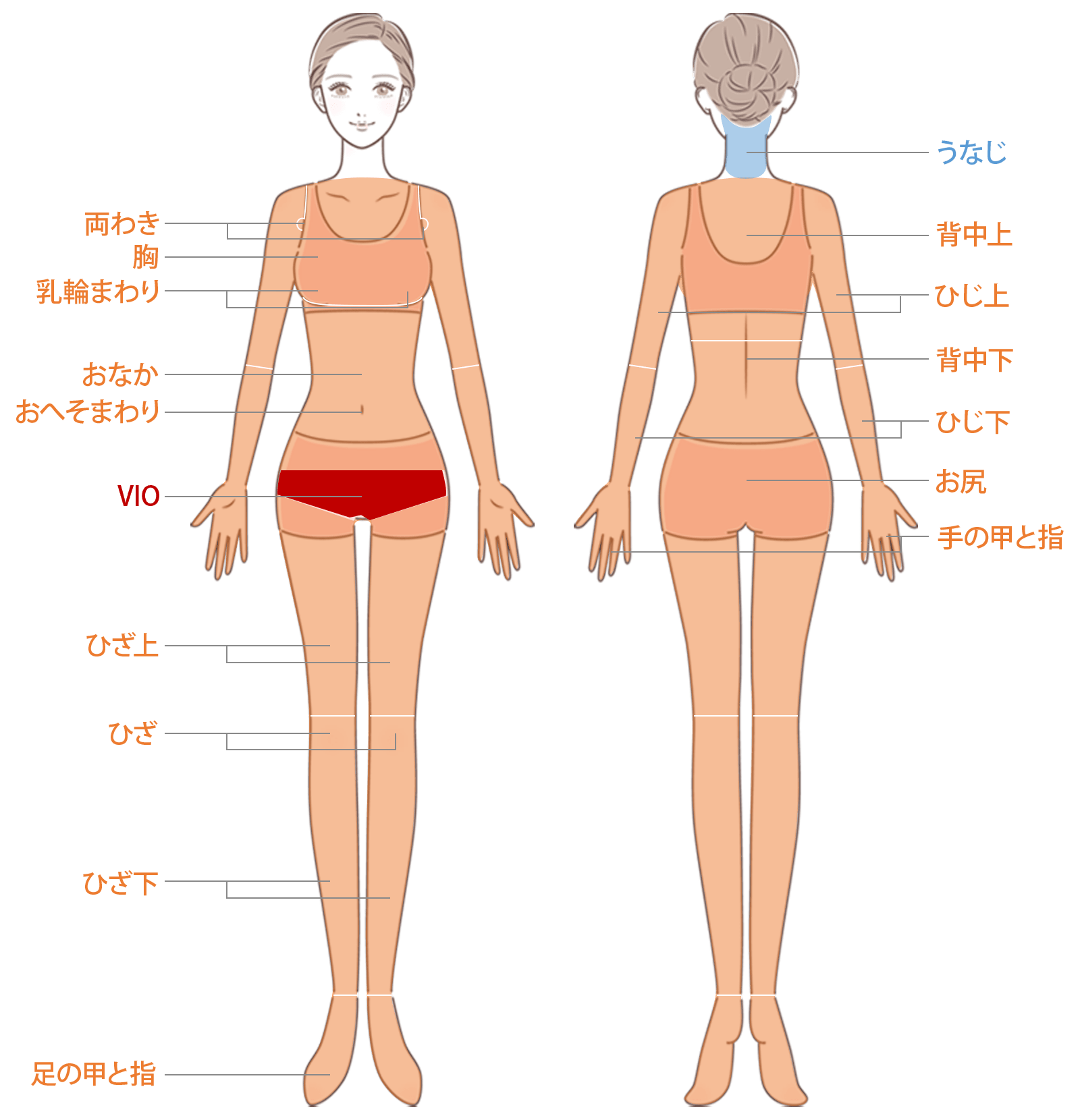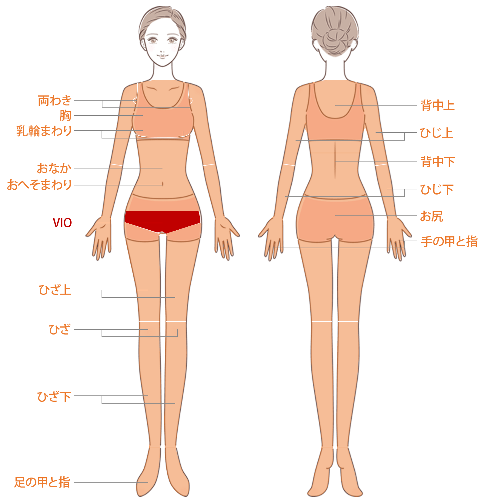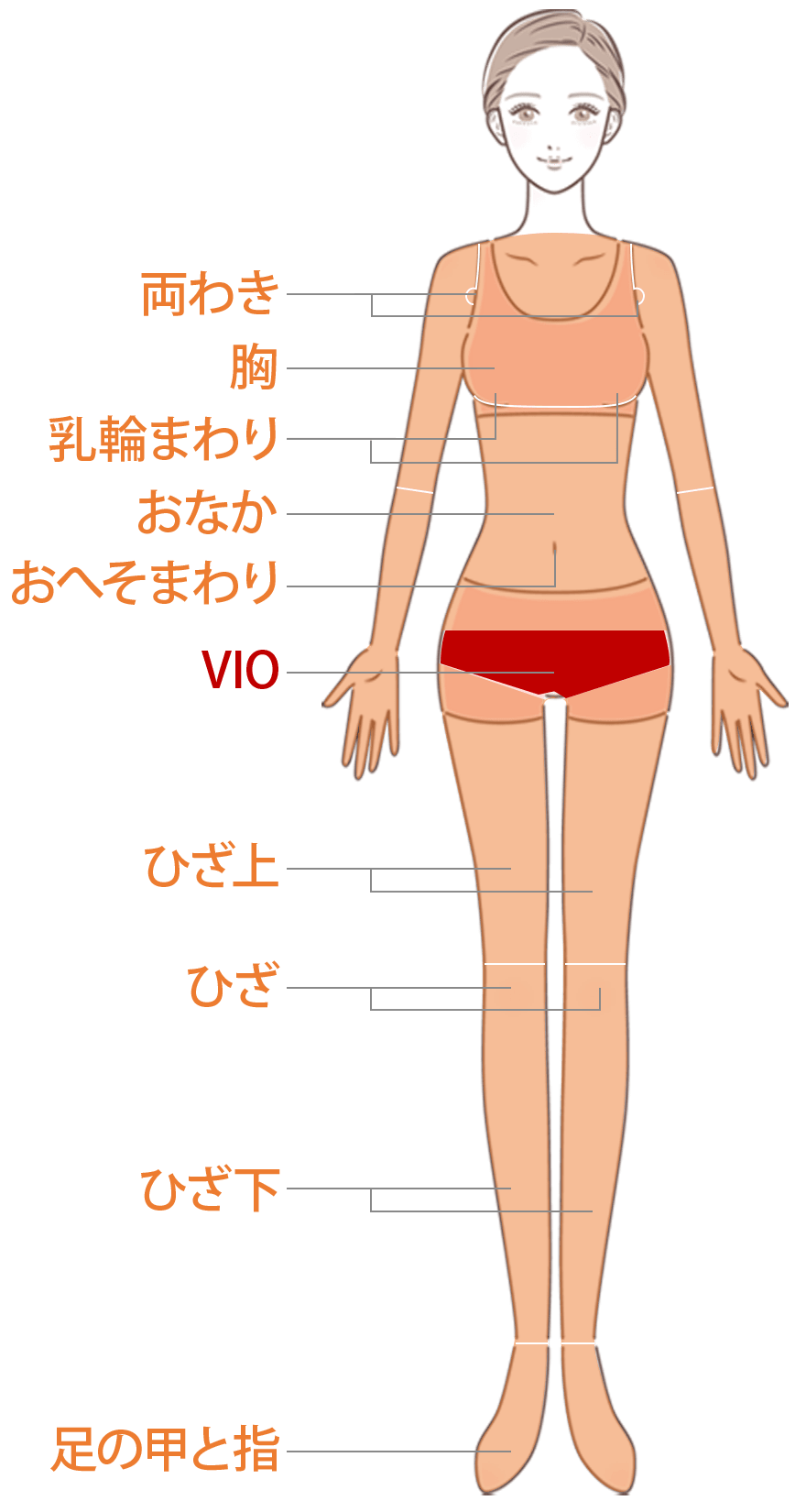 | VIO脱毛 | Vライン(ビキニライン・陰茎、陰茎周辺)Iライン(会陰部)Oライン(肛門周囲)が対象になります。 女性には以前から人気がありましたが、男性でも衛生面を気にされる方が多く、人気が上がってきています。 |