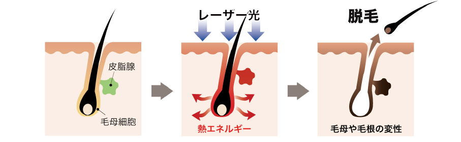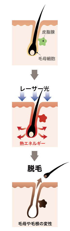 医療レーザー脱⽑。照射⼒が強く、⽑乳頭やバルジ領域を熱破壊!